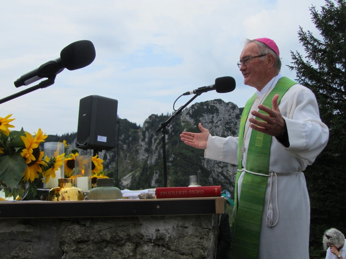 Nur etwa eineinhalb Stunden vor dem geplanten Beginn dieser ganz besonderen Bergmesse wäre an eine Veranstaltung im Freien noch nicht zu denken gewesen. Einige dunkle Wolken entledigten sich über der Kampenwand blitzartig ihrer Wasserlast. Die ersten Teilnehmer waren zu dieser Zeit schon auf dem Berg. Ebenso der Zelebrant, Weihbischof Dr. Bernhard Haßlberger. Vorerst saß man in der Seilbahnstation und der nahe gelegenen Sonnenalm fest.