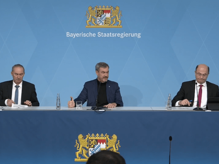 Ministerpräsident Söder stellt nach der Haushaltsklausur des Ministerrats am 11.11.2025 gemeinsam mit Finanzminister Füracker und Wirtschaftsminister Aiwanger die Ergebnisse vor. Screenshot aus der Liveübertragung der Pressekonferenz auf Facebook. Quelle: Bayerische Staatskanzlei/bayern.de